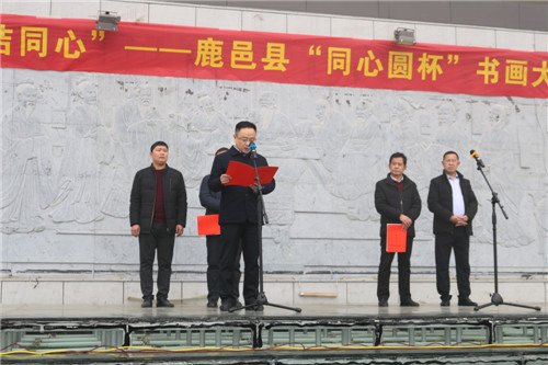 為慶祝改革開放40周年,深入學習習近平新時代中國特色社會主義思想和黨的十九大精神, 鞏固和發(fā)展愛國統(tǒng)一戰(zhàn)線,在新時代畫好最大同心圓, 團結(jié)和帶領(lǐng)各族各界人士深入挖掘中華優(yōu)秀傳統(tǒng)文化蘊含的思想觀念、人文精神、道德規(guī)范,讓中華文化展現(xiàn)出永久的魅力和時代風采, 12月20日上午,由中共鹿邑縣委統(tǒng)戰(zhàn)部主辦、縣文學藝術(shù)界聯(lián)合會承辦、“天地人筆業(yè)”協(xié)辦的鹿邑縣“紀念改革開放四十周年·同心圓杯書畫大賽” 在城區(qū)問道苑廣場開展??h委常委、統(tǒng)戰(zhàn)部部長閆家明出席開幕式并講話。縣委統(tǒng)戰(zhàn)部常務(wù)副部長李繼良,縣文聯(lián)主席王亞飛,副主席于連河以及本次全體獲獎和入展作者,文聯(lián)所屬各協(xié)會主席團成員近200人參加開幕式。