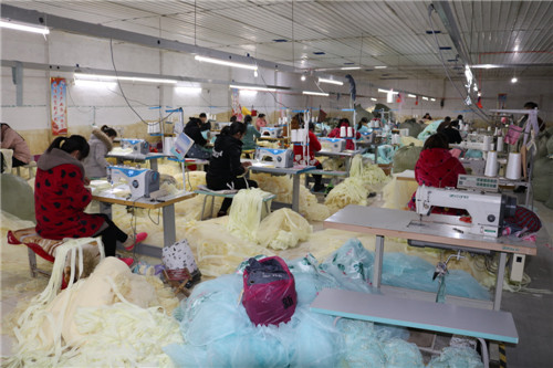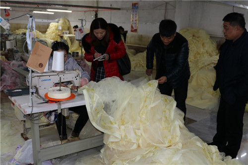 “對(duì)于有勞動(dòng)能力的貧困戶及留守婦女,只要報(bào)名一律錄用,根據(jù)個(gè)人能力提供合適崗位,免費(fèi)進(jìn)行業(yè)務(wù)技能培訓(xùn),變‘輸血’變‘造血’;成為熟練工的貧困戶,月收入均可達(dá)到3000元以上?!苯饎P盛家紡“扶貧車間”位于吳小廟村邊,該公司負(fù)責(zé)人趙開軍是楊湖口鎮(zhèn)走出去打工、在事業(yè)有成后返鄉(xiāng)創(chuàng)業(yè)的一個(gè)普通80后,他的公司總部位于江蘇省南通市,像這樣的幾百人加工基地附近有二三家,加工的產(chǎn)品一般是通過天貓、京東等知名電商平臺(tái)在全國進(jìn)行銷售,實(shí)行網(wǎng)上實(shí)行統(tǒng)一下單、就近發(fā)貨,這幾個(gè)基地主要負(fù)責(zé)長江以北市場銷售,公司去年年銷售額已突破5000萬元,解決周邊村莊數(shù)千人在門口就業(yè),帶動(dòng)100多戶貧困戶脫貧。