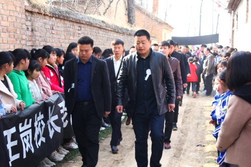 院內(nèi)正廳上方,懸掛著黑底白字的橫幅“沉痛悼念王崗?fù)尽保和獾缆穬蓚?cè),擺滿了人們敬獻的黑紗、花圈。市教體局領(lǐng)導(dǎo)來了,縣政府副縣長肖煒來了,縣教體局局長劉現(xiàn)營來了;局黨組成員、各鄉(xiāng)校校長來了,王崗最愛的學(xué)生、同事來了;學(xué)生家長也來了……大家胸佩白花,向這位愛崗敬業(yè)的基層校長表示崇高的敬意和深切的哀悼。