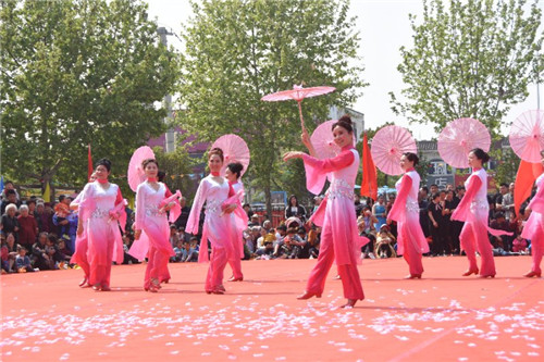 比賽進(jìn)行到將近一半時(shí)候,縣第二實(shí)驗(yàn)小學(xué)參賽隊(duì)帶來的舞蹈《麗人行韻》將大賽推向了高潮。表演開始,身著天藍(lán)漸變色長裙的38名姑娘手持彩傘一字列隊(duì)緩步入場,正當(dāng)觀眾們看得入神時(shí),她們突然將彩傘都齊刷刷地舉過頭頂并瞬間打開,無數(shù)粉紅色的花瓣從彩傘中紛紛飄落,像從碧藍(lán)的天空中下起了無盡的花瓣雨。選手們短短幾秒鐘的舉動,在廣場上勾勒出了一個(gè)人間仙境,引人入勝。在粉紅花瓣的映襯中,傘下腳步輕盈的女子們微微舞動,美若天仙,婀娜多姿,展現(xiàn)了“人面桃花相映紅,桃花依舊笑春風(fēng)”的作品主題。