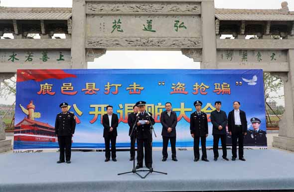 4月25日上午,鹿邑縣召開(kāi)打擊“盜搶騙”專(zhuān)項(xiàng)行動(dòng)公開(kāi)退贓大會(huì)??h委常委、政法委書(shū)記侯自峰出席會(huì)議并講話。縣公、檢、法、司等有關(guān)部門(mén)負(fù)責(zé)人與群眾代表近300人參加退贓大會(huì)。