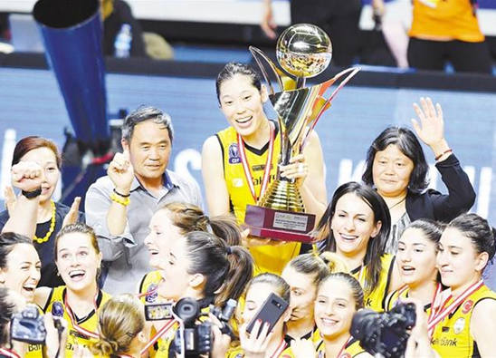 5月5日,瓦基弗銀行隊(duì)球員朱婷(中上)邀請(qǐng)父母進(jìn)入球場(chǎng)慶祝奪冠。 當(dāng)日,在2018-2019賽季土耳其女排超級(jí)聯(lián)賽決賽第五回合比賽中,瓦基弗銀行隊(duì)客場(chǎng)以3比0戰(zhàn)勝伊薩奇巴希隊(duì),以總比分3比2成功衛(wèi)冕聯(lián)賽冠軍。朱婷也蟬聯(lián)了聯(lián)賽MVP(最有價(jià)值球員)稱號(hào)。 新華社記者 徐速繪 攝
