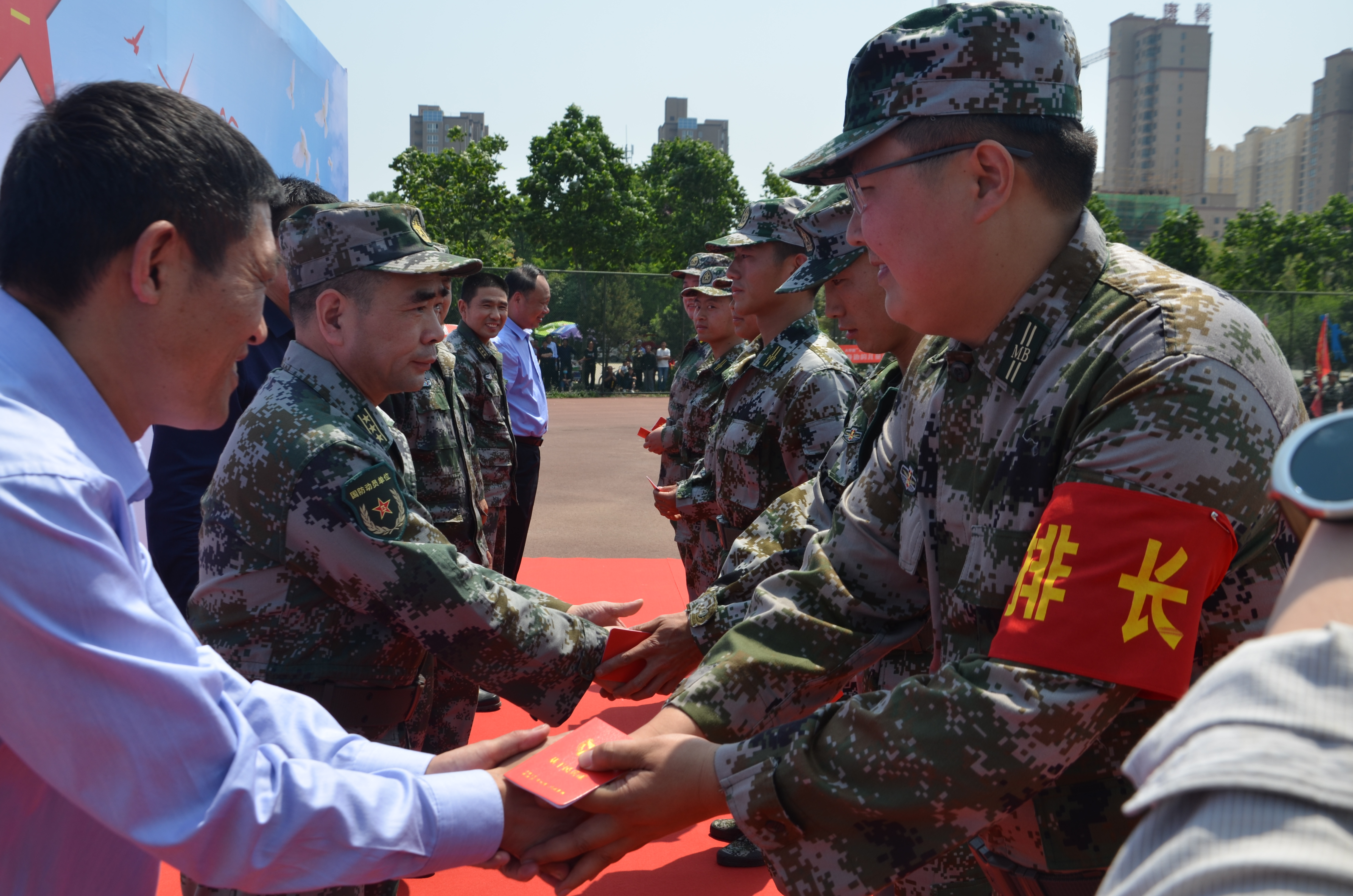 大會在雄壯的《解放軍軍歌》中拉開了序幕??h委常委、人武部政委曹新旺宣布基干民兵排以上干部任職命令,縣委常委、常務副縣長郝四春代表縣委、縣政府、縣人武部為基干民兵分隊授旗,綜合應急連指導員、縣人武部政工科長李紅藝帶領全體民兵面對國旗宣讀民兵誓詞。在場領導向民兵代表發(fā)放了基干民兵證和入隊通知書,民兵代表和教練員代表分別進行了表態(tài)發(fā)言。