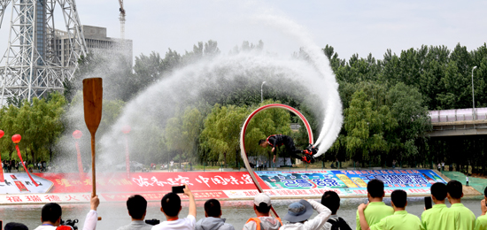 水上飛行器表演是觀賞性較高的水上表演之一,俗稱水上“鋼鐵俠”,是一項由外國人發(fā)明的水上摩托表演項目,兩人一組,一人駕駛摩托艇,一人在水面表演。飛行器的動力主要來自于摩托艇,靠一根水管連接在摩托艇的噴射口,通過摩托艇的噴射動力把人沖起來,最高能達(dá)到10米。表演者要在空中完成各種花樣動作,這對表演者的平衡及身體協(xié)調(diào)能力要求很高。