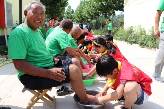 7月的太康,酷熱難耐。6日上午8時(shí)許,一輛公交車穩(wěn)穩(wěn)停靠在太康縣芝麻鄉(xiāng)敬老院門口,車上下來20多名身穿紅馬甲的學(xué)生志愿者,他們抬著米、面、油和雞蛋等物品走進(jìn)敬老院。坐在門口等候的老人們,樂呵呵地上前迎接客人。整個(gè)敬老院一下子熱鬧起來。放下物品,孩子們立馬開始勞動(dòng),他們從老人們宿舍搬出馬扎、板凳,在院中擺放安穩(wěn),扶著老人坐上去,開始給老人洗腳。正上初中一年級的李博泉細(xì)心地幫72歲的張照志老人摳掉趾甲縫和腳底的污垢。張老漢流淚了:“這輩子有人給我洗腳,我真是不知道哪修來的福氣……”