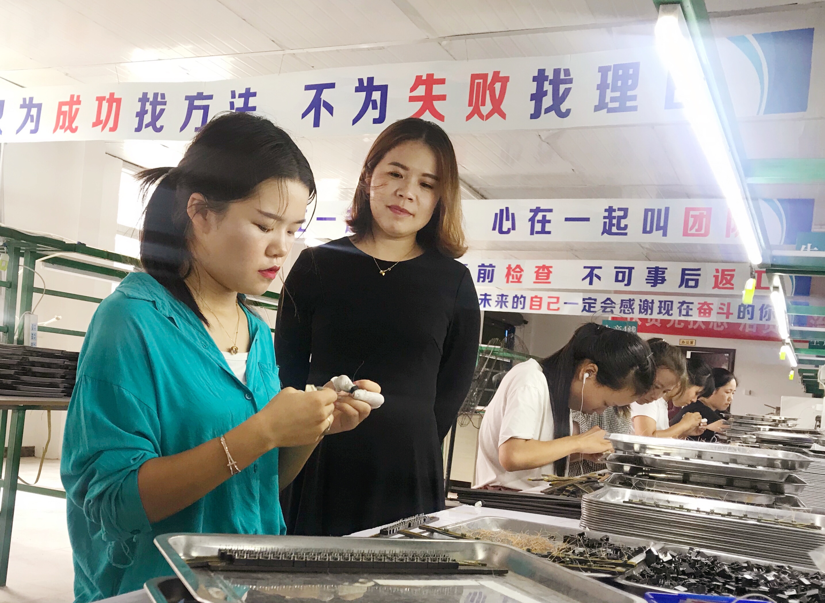 河南雙晨電子科技有限公司去年落戶西華縣大王莊鄉(xiāng)劉老家村后,生產(chǎn)線安裝繞線機(jī)、點(diǎn)焊機(jī)、包裝機(jī)等近50臺(tái),產(chǎn)品廣泛用于液晶顯示屏、計(jì)算機(jī)、數(shù)碼相機(jī)、醫(yī)療設(shè)備、汽車等,目前已安置群眾就業(yè)50余人,其中貧困戶近20人,人月均收入3000多元,讓村民在家門(mén)口實(shí)現(xiàn)就業(yè)增收。圖為該公司總經(jīng)理在生產(chǎn)車間了解工人收入和家庭生活情況。