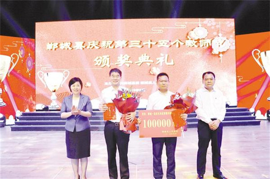 頒獎儀式上,該縣隆重表彰了2019年尊師重教先進單位、十佳師德標兵、最具影響力校長、先進小學幼兒園、先進初中、先進中心校、2019年高招目標管理先進單位、職業(yè)學校先進單位等。其中,獎勵鄲城一高教科研經費245萬元、獎勵鄲城二高教科研經費53萬元,授予縣教體局局長劉現營、鄲城一高校長劉成章2019年鄲城教育突出貢獻獎,并獎勵劉成章獎金10萬元。