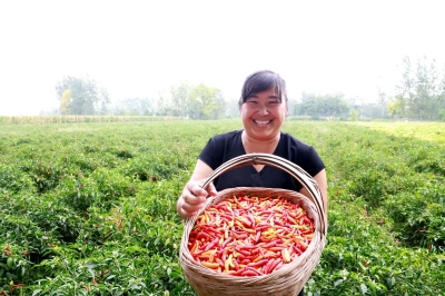 在朱樓行政村,朱高杰、王麗夫妻倆正帶領(lǐng)20多名采摘工人在辣椒田里采摘艷紅、泡椒兩個(gè)品種,地頭停放著盛滿辣椒的三輪車和五六個(gè)蛇皮袋,火紅的辣椒映襯著小兩口臉上燦爛的笑容:“大豐收呀,這塊地是泡椒,還沒(méi)有出地頭,就劃3.8元一斤了,走向市場(chǎng)至少五六元錢。咱吃的泡椒鳳爪、泡椒罐頭,都是這做的。像那塊地的艷紅,就像它的名字一樣又紅又鮮艷,出地頭就得七八塊,賣到市場(chǎng)上都10多元一斤,主要賣到四川、湖北等地,這是火鍋底料、炒菜的必備品,這是個(gè)炒出來(lái)有香味的辣椒品種?!蓖觖惸苷f(shuō)會(huì)道,而且在她的帶動(dòng)下,全鄉(xiāng)許多親朋好友都在種植辣椒。像王麗一樣,汲水鄉(xiāng)種植辣椒面積突破了1萬(wàn)畝,整個(gè)鄲城縣種植辣椒突破5萬(wàn)畝。