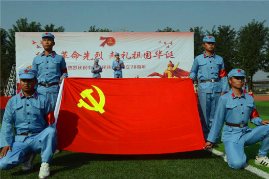 當(dāng)天上午,小朋友在家長和老師的帶領(lǐng)下,身穿紅軍軍服,手里揮動(dòng)著小紅旗,鮮嫩的小臉蛋上貼著小國旗,雄赳赳氣昂昂地走在體育場上,邁著整齊堅(jiān)定的步伐,昂首挺胸,高唱國歌,共同祝福偉大的祖國70華誕。