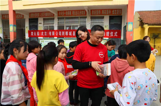 10月24日,周大福河南區(qū)域負(fù)責(zé)人岳磊一行15人,帶著書(shū)包、文具、足球、藍(lán)球等學(xué)習(xí)用品,來(lái)到鄲城縣丁村鄉(xiāng)徐莊小學(xué),為200余名學(xué)生送來(lái)了愛(ài)心大禮包。并為兩戶貧困戶送去了米面油等慰問(wèn)品。
