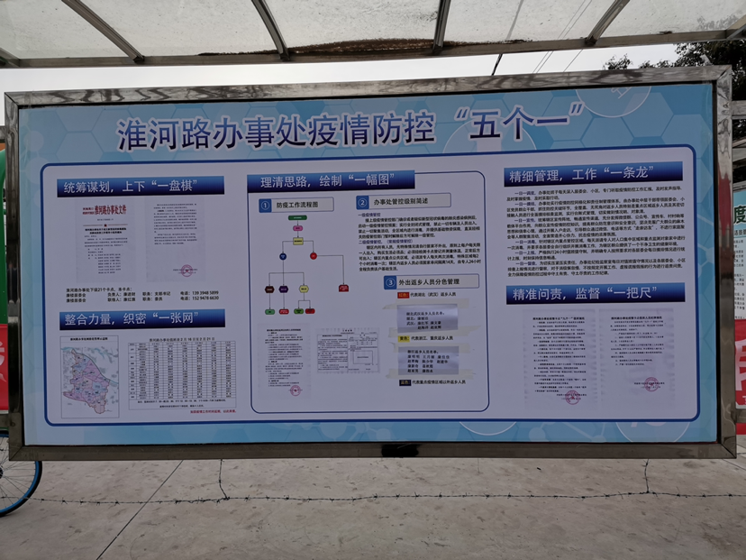 淮河路辦事處地處我市東南部,總?cè)丝诩s4萬(wàn)。轄區(qū)黃灘、孟營(yíng)、鄭洼、牛灘、劉新莊、姚灘、南徐、路莊、趙寨、麥仁店、康樓、徐莊等12個(gè)居委會(huì),有34個(gè)自然村,114個(gè)村民組,人口約39000人、面積20平方公里。根據(jù)轄區(qū)的實(shí)疫情防控工作,淮河路辦事處探索出一套疫情防控工作“五個(gè)一”流程。統(tǒng)籌謀劃,上下“一盤棋”; 整合力量,織密“一張網(wǎng)”; 理清思路,繪制“一幅圖”;精細(xì)管理,工作“一條龍”;精準(zhǔn)問責(zé),監(jiān)督“一把尺”。
