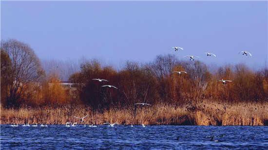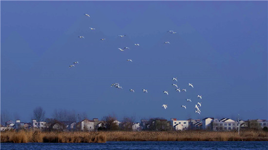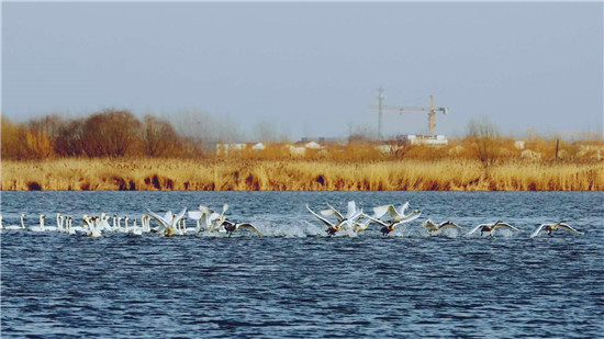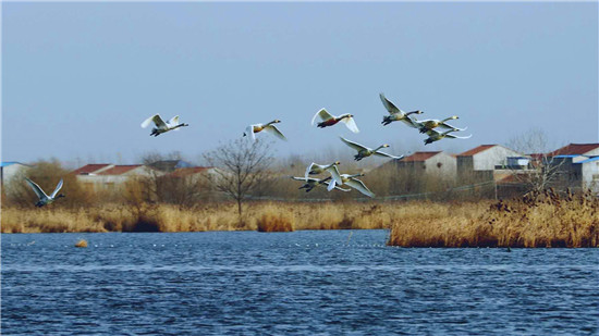 2月21日,50多只白天鵝在國(guó)家濕地公園淮陽(yáng)龍湖自由游弋、展翅翱翔的美麗畫面被記者一一收入鏡頭。記者現(xiàn)場(chǎng)看到,初春的龍湖,天藍(lán)水碧,萬物萌動(dòng)。這群白天鵝的到來,使萬畝龍湖一下子變得靈動(dòng)起來。它們有的在水面上自由覓食,一副悠然自得的神態(tài);有的時(shí)而煽動(dòng)翅膀,抖落長(zhǎng)途跋涉的疲憊;有的飛向藍(lán)天,盡情享受著春日暖陽(yáng)。為了不打擾這群“客人”,又能拍攝到相對(duì)清晰的圖片,記者環(huán)繞龍湖多處踩點(diǎn),用200mm鏡頭+2倍增距鏡,蹲守一天,最終在畫卦臺(tái)前湖岸向東南方向遠(yuǎn)距離拍攝到了這些美麗的畫面。