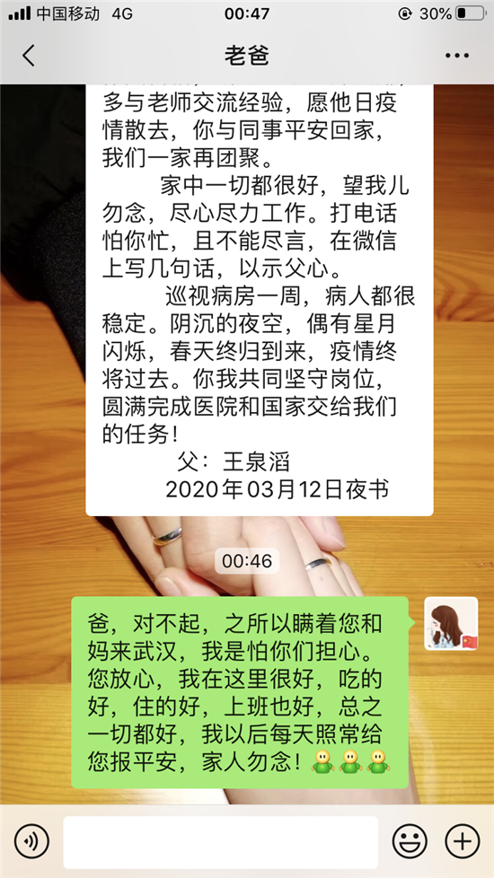 3月21日,周口援鄂醫(yī)療隊出征滿一月。當晚,王泉滔通過微信又鄭重給女兒說下這番話:一晃你在武漢一個月了,我和家人從你去武漢的擔心到現(xiàn)在的放心,這是國家給予我們的安心。農(nóng)民把地種好,教師把學教好,士兵把國門守好,醫(yī)護把病治好,都是自己的使命,更是自己的初心。人人懷揣私字,社會必敗,遭殃的終歸眾人;眾人心懷天下,萬物皆勝,受益的定是人人??吹胶幽喜糠衷踽t(yī)療隊從武漢凱旋歸來,雖然沒有你的身影,但是我們很高興,說明武漢的疫情已得到控制,我和家人一起期盼你早日歸來。但是還是要再次叮囑你,不要因為疫情到了最后而放松警惕,上下班路上注意安全,穿脫防護服不能有一絲懈怠,時刻保持警醒。年前你當了姑姑,雖然還沒有見到你侄子,但他和家人共同期待你平安回來。吾兒加油!