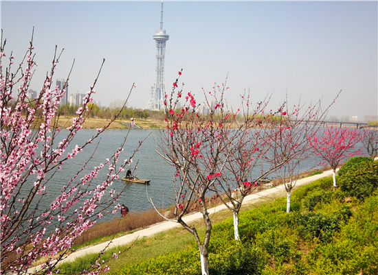 3月22日,周口市沙潁河碧波蕩漾,兩岸處處綠樹環(huán)繞,花兒姹紫嫣紅,兩岸綠影婆娑,一幅五彩繽紛春景的悅目畫面。