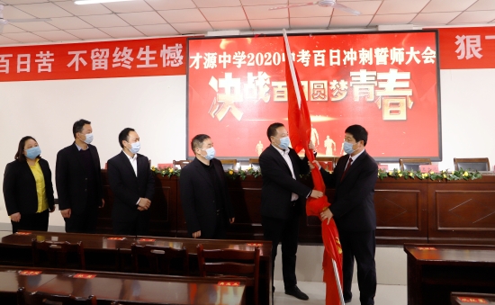 誓師大會現場,才源中學校長張醒民向九年級階段負責人授戰(zhàn)旗。師生代表面對直播鏡頭向全體初三師生發(fā)出鏗鏘誓言,號召大家奮勇爭雄,2020年再奪中考全市領先的佳績。誓詞為:凌志擎天,豪氣滿懷;天道酬勤,樂戰(zhàn)不怠;意堅心恒,信念常在;以我雄心,征戰(zhàn)未來;沖刺百日,只為無悔青春;人生綻放,定是風雨兼程;今日苦讀書厲兵秣馬,明朝進重點吐氣揚眉。