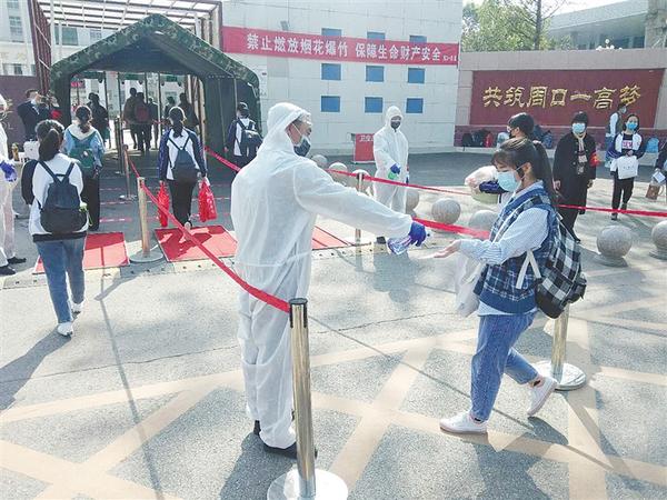 圖一 4月7日,周口一高三年級學(xué)生在入校前測量體溫。當(dāng)天,我市高中三年級學(xué)生正式復(fù)課,廣大學(xué)生按照疫情防控要求,錯(cuò)峰、錯(cuò)時(shí)有序入校。 記者 張洪濤 攝
