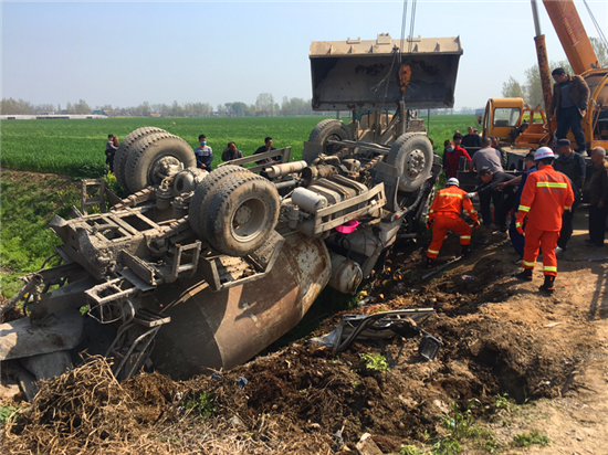 “馬失前蹄” 沈丘一攪拌車(chē)翻入溝內(nèi)