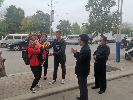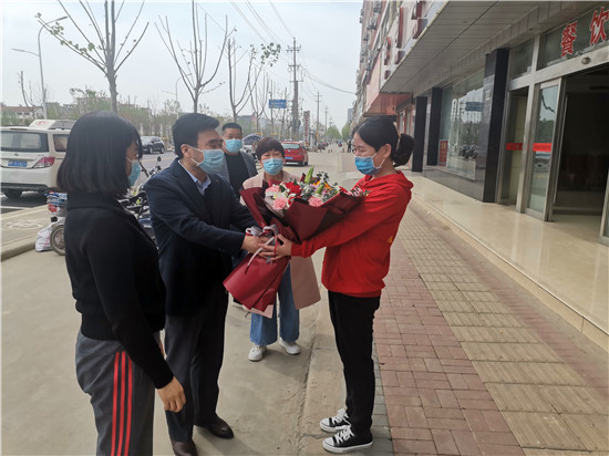 鄲城縣婦幼保健院院長(zhǎng)亢國(guó)良帶領(lǐng)副院長(zhǎng)羅素霞、護(hù)理部主任王翠蘭,到隔離點(diǎn)迎接該院援鄂英雄丁錕回家,為英雄送去鮮花,并全程護(hù)送丁錕安全返回家中。