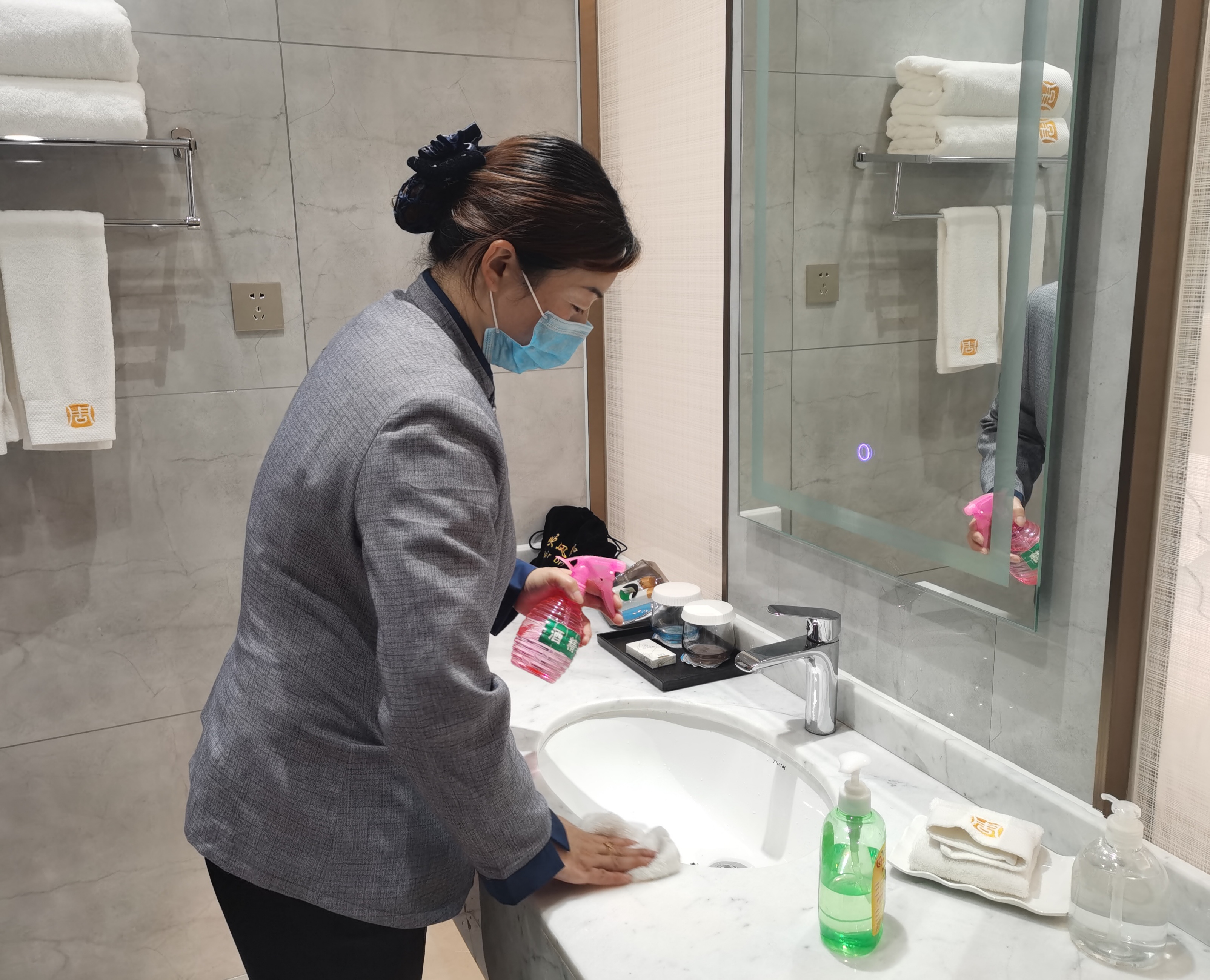 5月10日,記者在“兩會”駐地酒店看到,酒店工作人員不時對客房和公共場所、會議室進(jìn)行消毒、擦拭。受疫情影響,“兩會”駐地酒店工作人員認(rèn)真和精心準(zhǔn)備,加強(qiáng)了對代表、委員駐地消殺防疫,還貼心地放置了一次性電梯按鍵專用紙、酒精等物品。