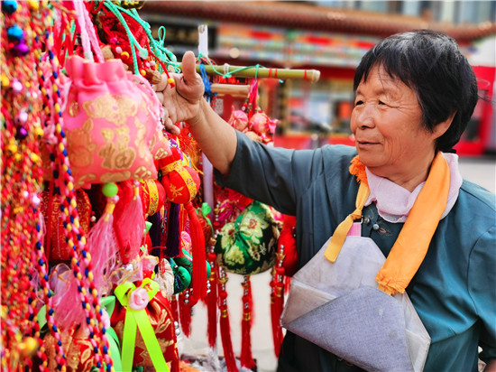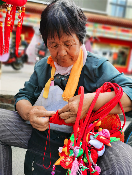 6月4日,呂大媽在懸掛剛做好的香包。端午節(jié)臨近,我市城區(qū)大街小巷,各種形象生動、精致可人的香包深受市民喜愛。