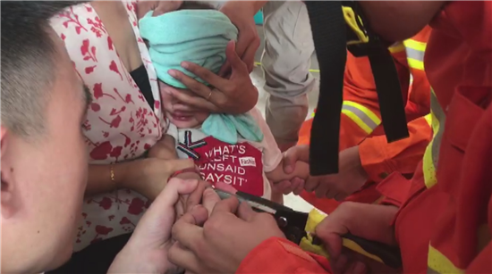 6月8日,鄲城消防救援大隊(duì)接到群眾報(bào)警稱(chēng)虎崗鄉(xiāng)郭集村顧莊2歲小男孩因?yàn)樨澩媸种副讳摴芴鬃∪〔幌聛?lái),請(qǐng)求幫助。接到報(bào)警后,鄲城縣消防救援大隊(duì)立即出動(dòng)2輛消防車(chē)10名指戰(zhàn)員前往處置。