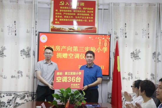 “方遠(yuǎn)房地產(chǎn)公司為第三實驗小學(xué)捐贈空調(diào),大大改善學(xué)校的降溫條件,為孩子們營造更為舒適的學(xué)習(xí)環(huán)境?!钡谌龑嶒炐W(xué)校長王玉剛表示,學(xué)校將以此為契機,號召廣大學(xué)生好好學(xué)習(xí),長大后回報社會;全校教職員工以優(yōu)異的教學(xué)業(yè)績回報社會,傳遞愛心,努力辦學(xué)生快樂、教師幸福、家長滿意的現(xiàn)代化學(xué)校。