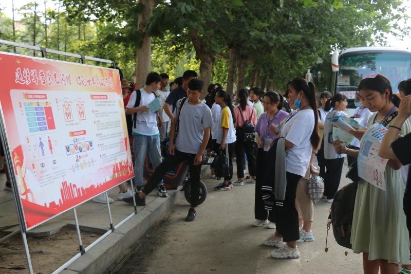 在該縣各標(biāo)準化高考考點征兵宣傳現(xiàn)場,人頭攢動、熱鬧非凡?!昂媚袃?,來當(dāng)兵”大紅條幅和“把忠心獻給祖國,把青春獻給軍營”“參軍報國盡義務(wù),熱血青年競風(fēng)采”的大型宣傳牌格外引人注目,內(nèi)容豐富的征兵宣傳展板一字排開,《征兵宣傳手冊》《大學(xué)新生應(yīng)征入伍宣傳單》《征兵政策宣傳解讀手冊》等征兵宣傳資料擺放在咨詢臺上一目了然,吸引了眾多的考生和家長駐足觀看,圍著咨詢臺詢問有關(guān)征兵事宜。