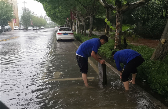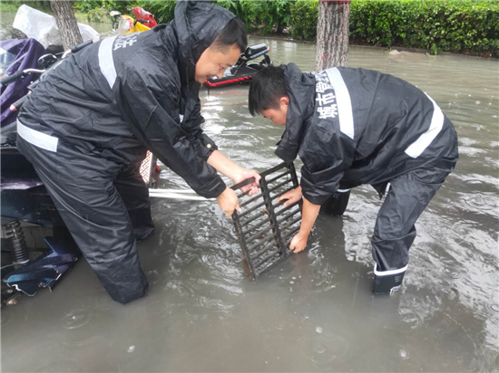 從7月21日傍晚起,商水縣普降暴雨,縣城區(qū)內(nèi)多處道路被淹,為保障群眾出行安全,縣城管局迅速啟動(dòng)防汛排澇緊急預(yù)案,多措并舉,全力開展防汛排澇工作。圖為7月22日,商水縣城管局應(yīng)急人員在商慶路北段徒手對(duì)道路雨水管網(wǎng)排水口進(jìn)行疏通。