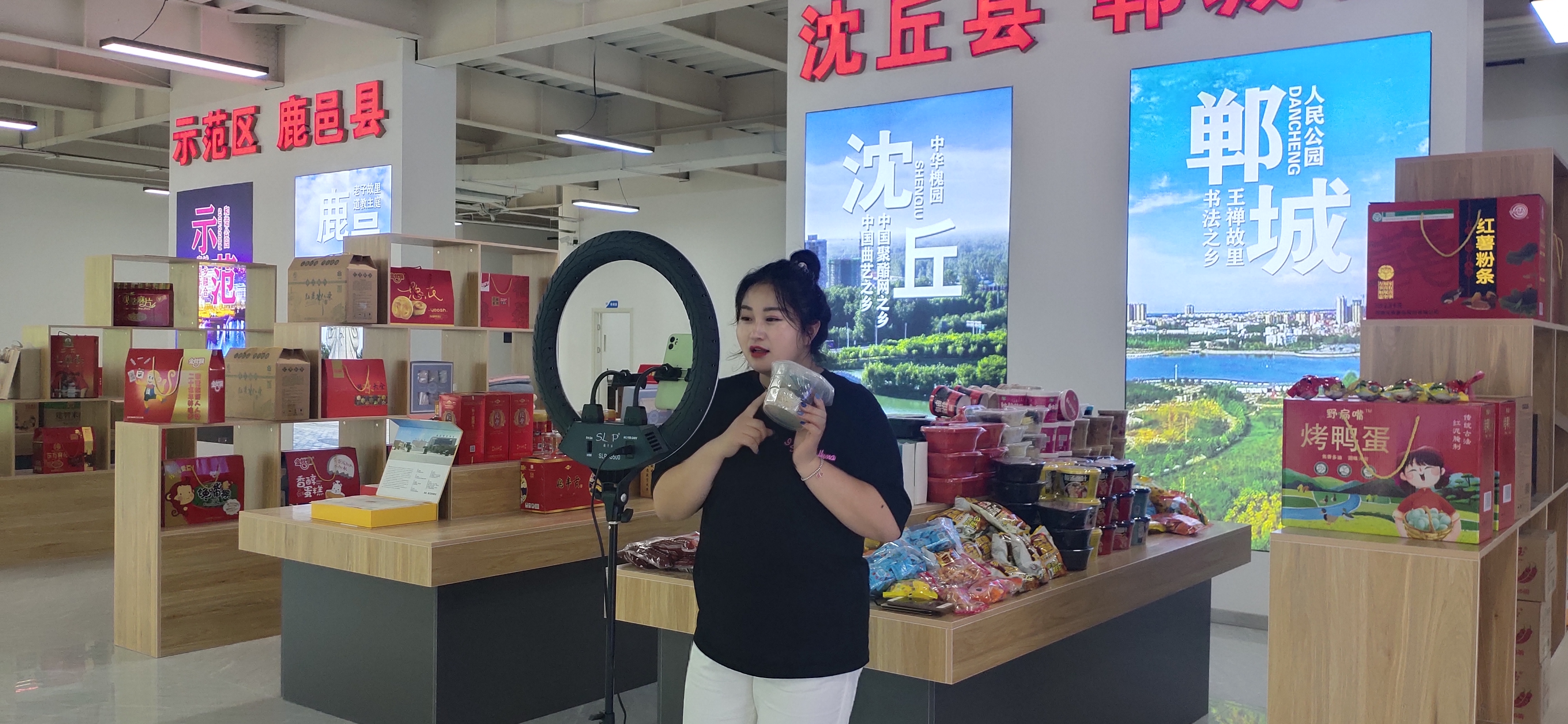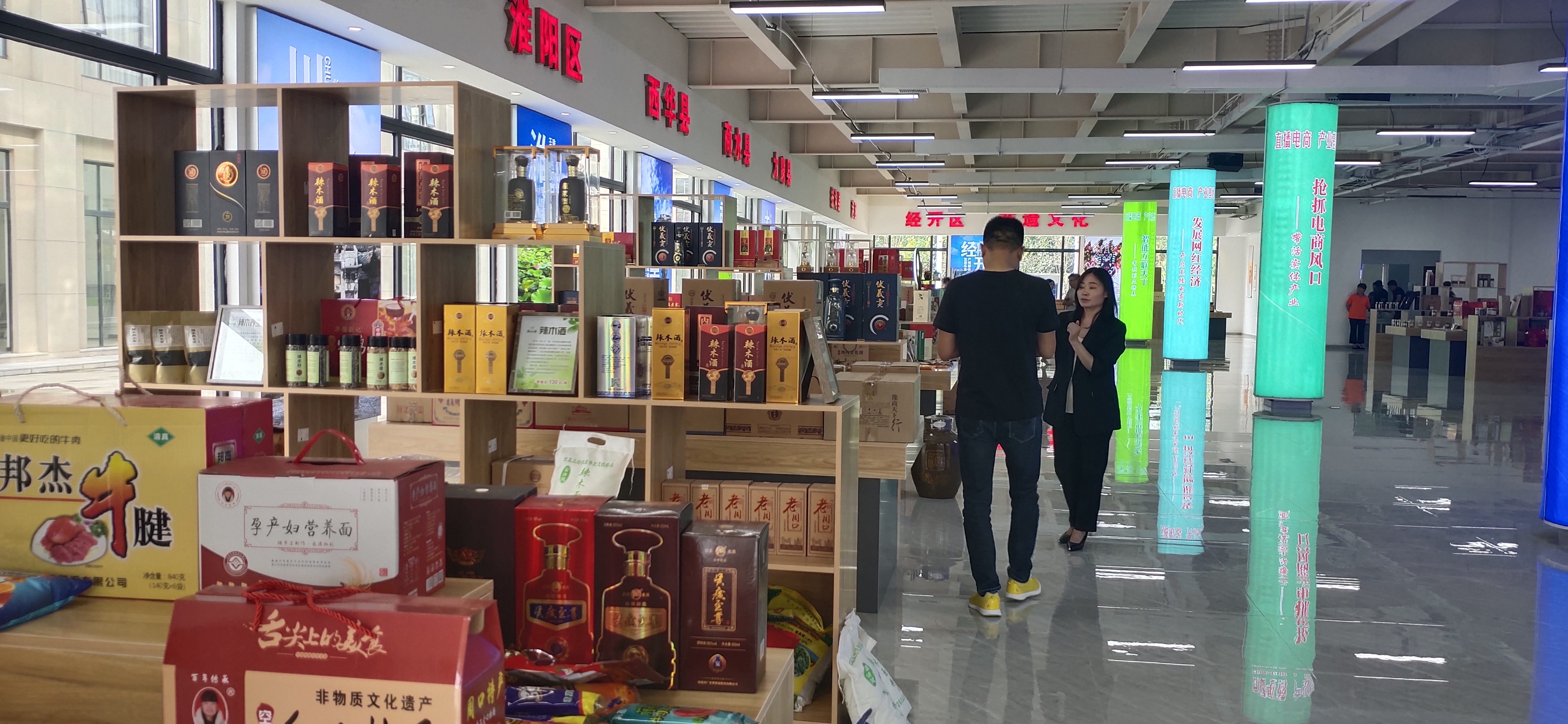 中心展廳面積達(dá)1000多平方米,按照不同縣(市、區(qū))劃分為十幾個區(qū)域,集中展示邦杰牛肉、伏羲貢酒、鄧城豬蹄、汝陽劉毛筆、三川豫龍復(fù)合肥等周口產(chǎn)品。這些產(chǎn)品都是來自各縣(市、區(qū))等地農(nóng)工副土特產(chǎn)品以及非遺產(chǎn)品。“我們將通過抖音、快手等視頻平臺,把這些產(chǎn)品銷往全國各地?!?該基地負(fù)責(zé)人、周口東方會展商會會長于海崗說。