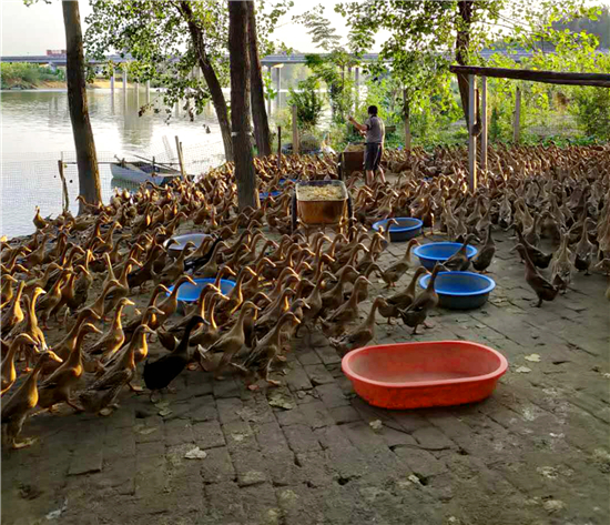 為了擴(kuò)大變蛋原料來源,她與當(dāng)?shù)丶巴獾囟嗉茵B(yǎng)雞企業(yè)簽訂訂單協(xié)議,滿足自己加工變蛋需要。為了滿足鴨蛋貨源,她在潁河灣一個(gè)支流處新建一個(gè)養(yǎng)鴨基地,目前養(yǎng)鴨5000余只,日產(chǎn)鴨蛋5000枚,基本滿足當(dāng)前加工咸鴨蛋需要。