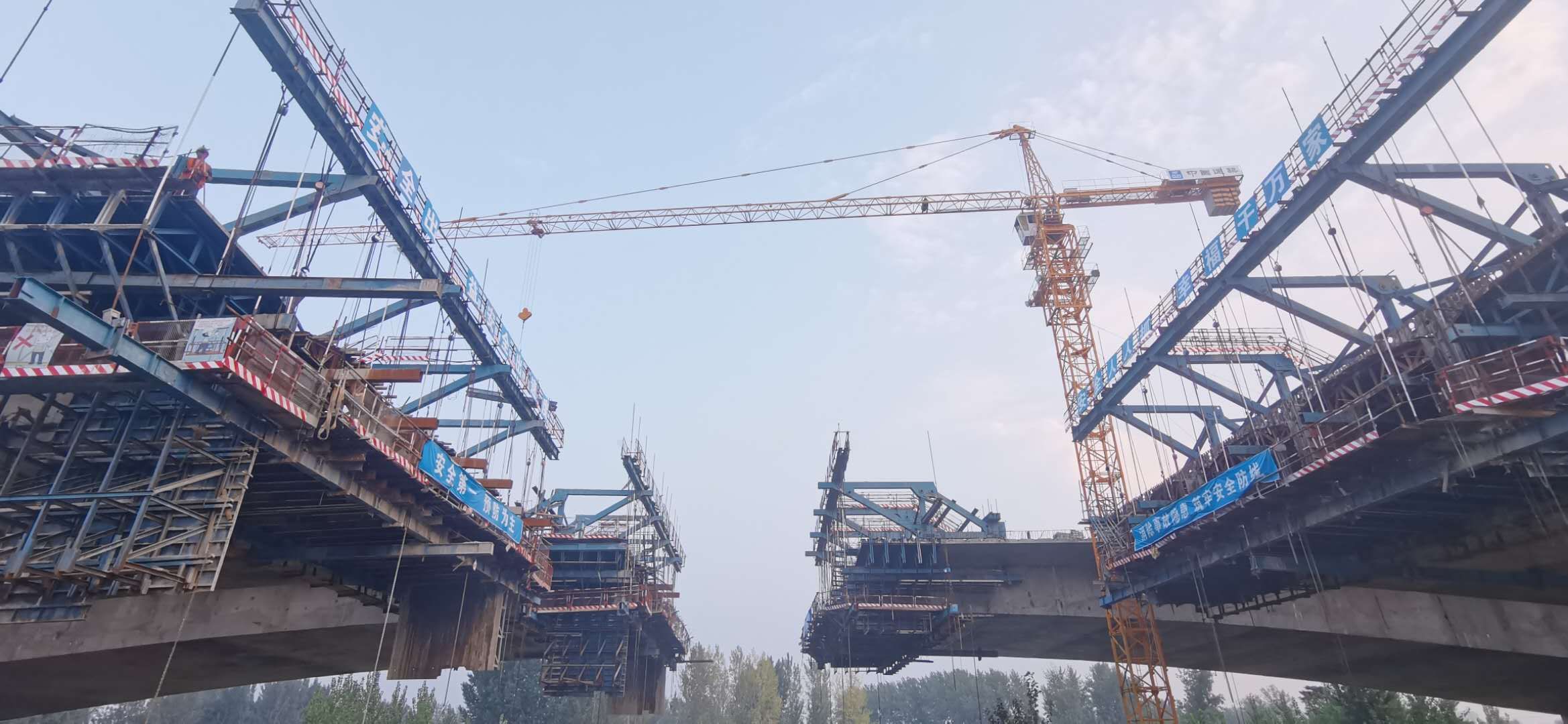 該橋東西兩側(cè)引橋采用40米預(yù)應(yīng)力箱梁,全橋40米預(yù)制箱梁252片,東側(cè)引橋梁板架設(shè)已全部完成正在進(jìn)行橋面系施工,西側(cè)引橋已架設(shè)半幅。主橋采用預(yù)應(yīng)力變截面連續(xù)現(xiàn)澆梁,懸澆段共16個(gè)節(jié)段,采用四套菱形掛籃;左幅已施工至15號(hào)節(jié)段,即將開(kāi)始合龍段施工;右幅已施工至12號(hào)節(jié)段。