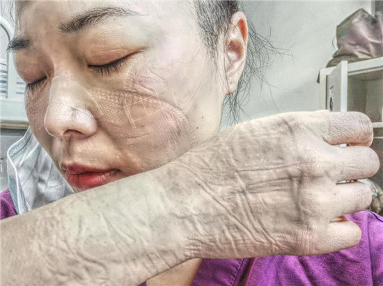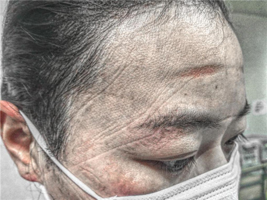 因?yàn)樾鹿诜窝椎膹?qiáng)傳染性,胡奔奔每次去病區(qū)上班都要全副武裝,而且為保證在6個(gè)小時(shí)的工作時(shí)間內(nèi)不被暴露,不能去衛(wèi)生間,不能喝水,還要穿上成人紙尿褲以防萬(wàn)一。這樣下來,汗?jié)褚路浅J?,而且下班后脫掉防護(hù)裝備后,她原本清秀白皙的臉上,滿是深深的皺褶,久久難以恢復(fù),惹人心疼。給家人報(bào)平安時(shí),胡奔奔甚至不敢視頻聊天,只能語(yǔ)音安慰家人。