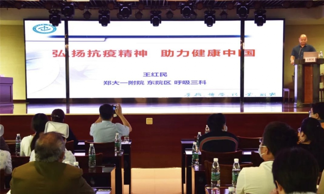 王紅民教授曾經(jīng)參加河南省援鄂醫(yī)療隊(duì),他給大家分享了在武漢第一家方艙醫(yī)院——江漢方艙醫(yī)院工作時(shí)的抗疫故事,當(dāng)王教授說起援鄂醫(yī)療隊(duì)“疫情不退,絕不言歸”的口號時(shí),臺下響起雷鳴般的掌聲。