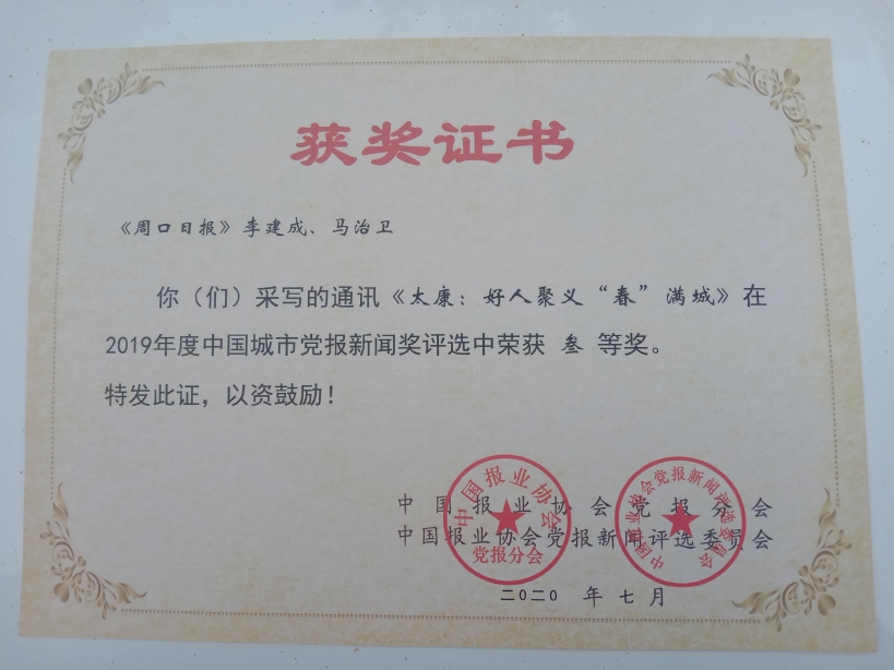 繼太康“五養(yǎng)模式”榮獲3項省級以上新聞大獎之后,日前從周口報業(yè)集團新聞研究室再次傳來好消息,《周口日報》頭版刊發(fā)的太康“好人之城”通訊《太康:好人聚義“春”滿城》(作者:李建成 馬治衛(wèi))一文,榮獲中國城市黨報新聞獎三等獎。