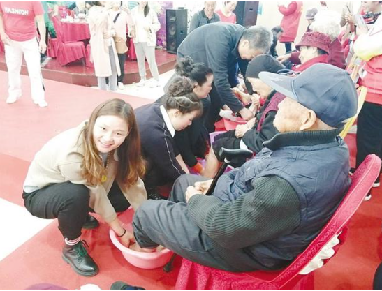 重陽節(jié)當(dāng)天,周口市總工會、周口市教體局、川匯區(qū)供銷社在鴻運酒店舉辦“九九重陽節(jié) 濃濃敬老情”孝老愛親活動,邀請200多名社區(qū)老年人及家屬參加?;顒蝇F(xiàn)場,家屬為老人進(jìn)行了洗腳(如圖),主辦方安排了精彩的文藝演出,博得觀眾陣陣掌聲,讓社區(qū)老人過了一個歡樂祥和的重陽節(jié)。