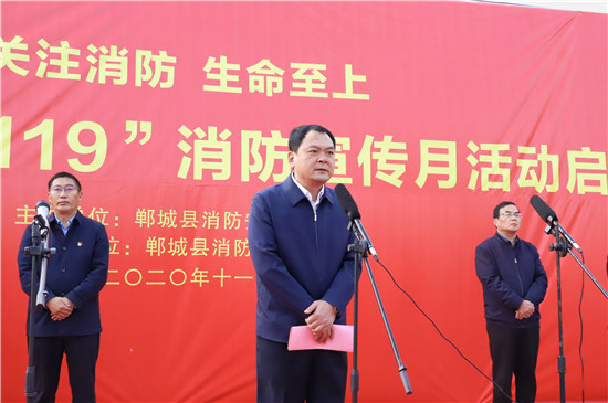 11月11日,鄲城縣在世紀(jì)廣場舉行2020年消防宣傳月活動啟動儀式,目的是進(jìn)一步提高全民消防安全意識,促使“關(guān)注消防 生命至上”的主題深入人心,廣泛發(fā)動社會各界關(guān)注消防、參與消防,營造良好的宣傳氛圍,預(yù)防和減少火災(zāi)事故發(fā)生,確保人民群眾生命財(cái)產(chǎn)安全。縣長李全林出席會議并宣布消防宣傳月活動啟動,縣委常委、常務(wù)副縣長胡友濤主持會議,縣領(lǐng)導(dǎo)謝超、王彪、陳鳳祥、李素梅及縣公安局政委趙紅建參加會議。