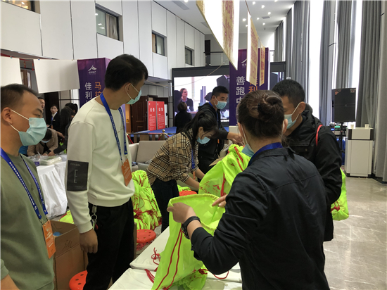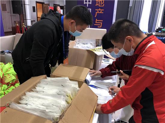 11月12日上午,記者在位于八一大道與文昌大道交叉口的佳利地產(chǎn)營銷中心門口看到,今年由于疫情管控的需要,參賽選手領(lǐng)取裝備前需要先展示自己的健康碼,并配合醫(yī)護(hù)人員測量體溫,進(jìn)入現(xiàn)場還需戴口罩。在一樓活動大廳,來自周口馬拉松協(xié)會的志愿者們先為選手確認(rèn)身份信息,再根據(jù)選手的身材、體型為其發(fā)放含有不同型號運(yùn)動衣的背包。最終,每個(gè)參賽選手都會領(lǐng)到一個(gè)熒光綠色的小背包,里面裝有號碼布、參賽長袖T恤、存衣包、手套、一次性風(fēng)雨衣和一本官方手冊等。