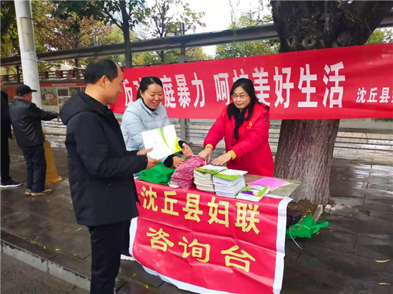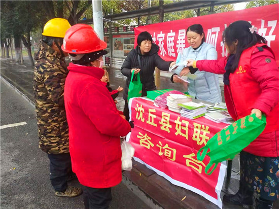 11月25日是國際反家庭暴力日。為進(jìn)一步提高全社會(huì)反家庭暴力意識(shí),加大對(duì)《反家庭暴力法》的宣傳,有效預(yù)防和制止家庭暴力,促進(jìn)家庭和諧,保障婦女群眾在婚姻家庭中的合法權(quán)益。為此,沈丘縣婦聯(lián)在城區(qū)組織開展了以“反對(duì)家庭暴力,呵護(hù)美好生活”為主題的法治宣傳活動(dòng)。