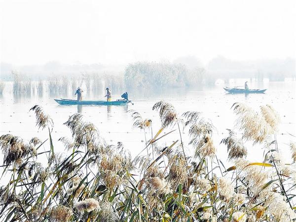 12月14日,兩艘冬捕的漁船在淮陽區(qū)龍湖布網(wǎng)捕魚。湖岸蘆葦搖曳,遠(yuǎn)處薄霧蒙蒙,景色迷人,恰似水墨丹青。 記者 杜欣 攝