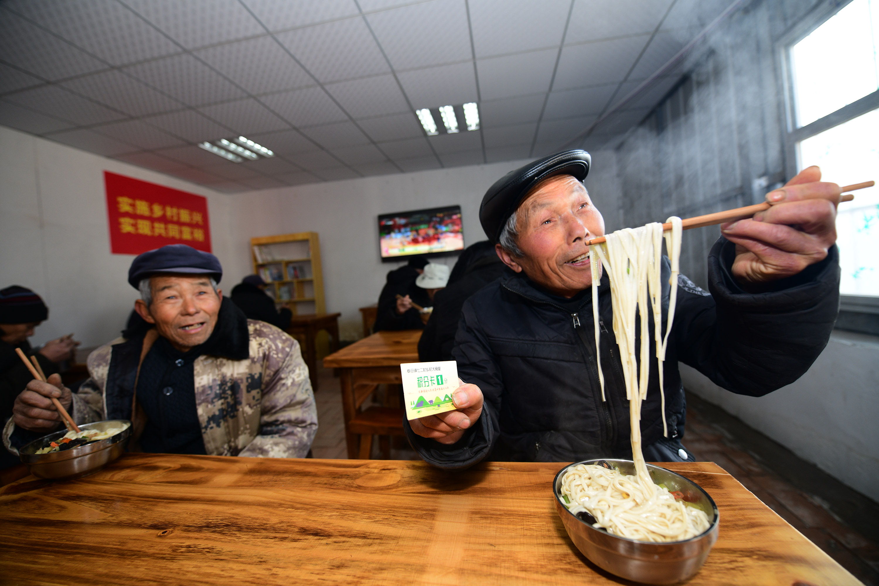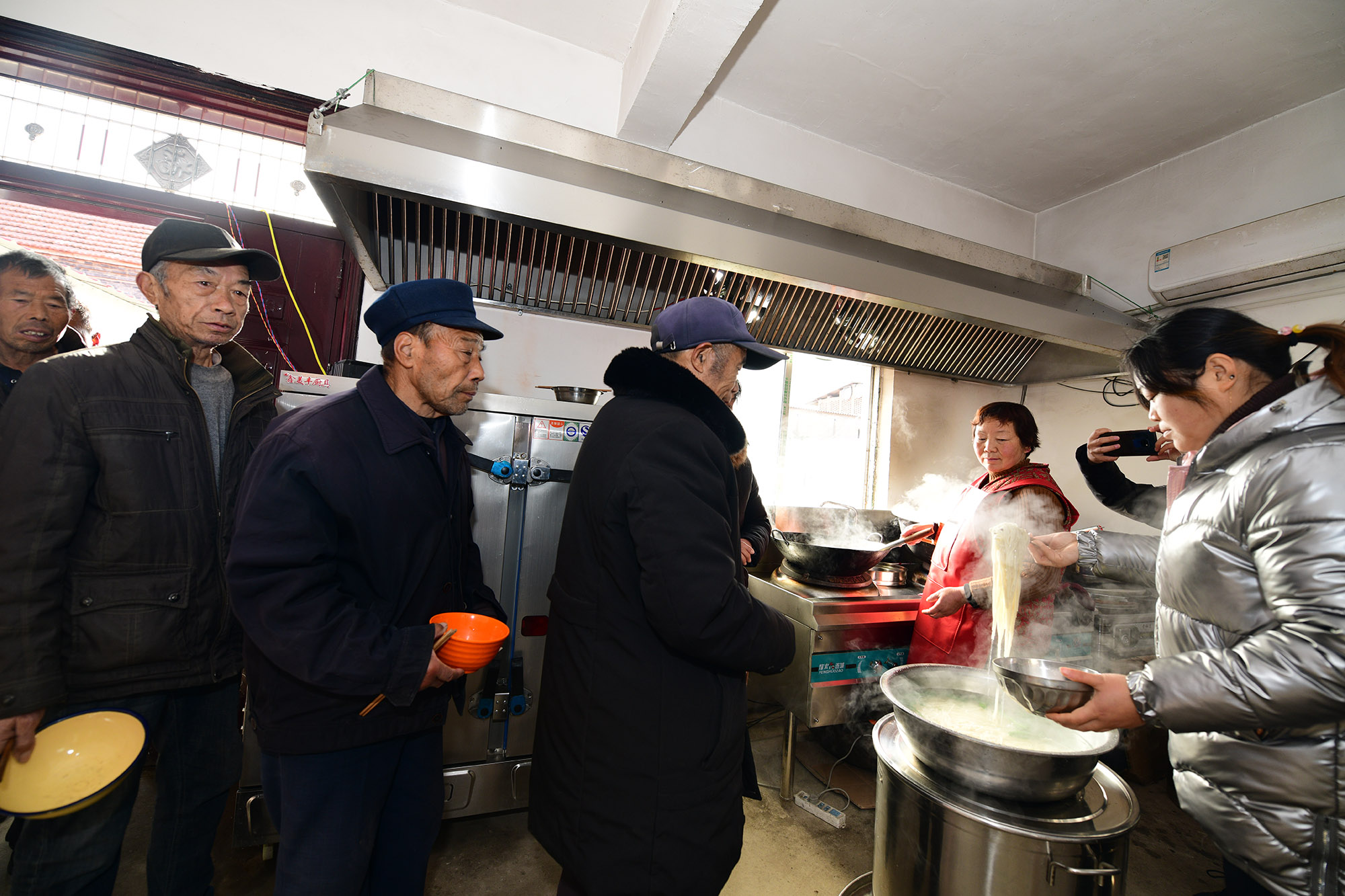 兩個月前,經(jīng)過籌備,七里倉二村的村食堂建成,大鍋飯開伙。食堂設在一家去世的五保戶家里。村里將房子內(nèi)外粉刷一遍,還買來了廚具、桌椅。做大鍋飯的是村里的兩名留守婦女。記者于12月15日中午趕來時,村食堂正開飯,老人們憑票打飯,午飯是臊子面。老人每人端一碗,來到飯廳就餐。這里有村里裝的電視,大家邊聊天邊吃飯邊看電視,其樂融融。