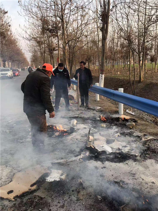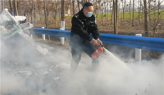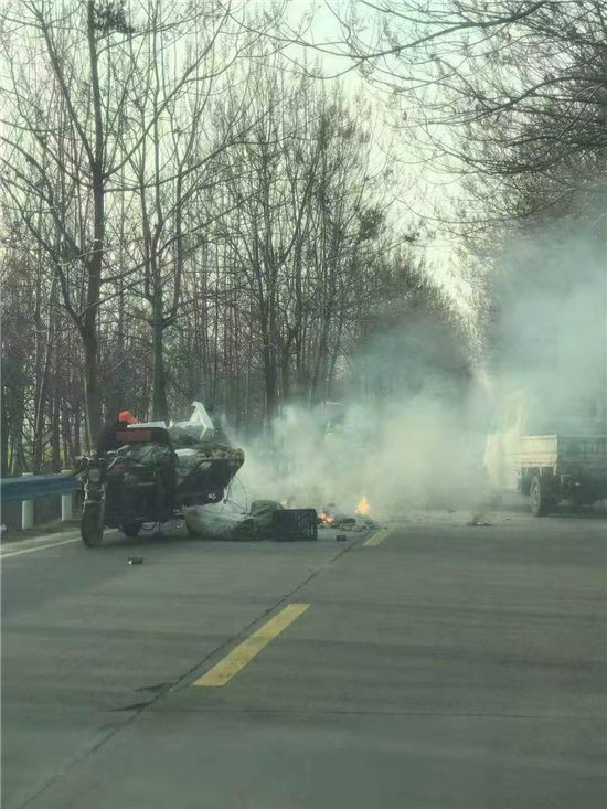 當(dāng)日下午4點(diǎn)左右,太康縣交警大隊(duì)二中隊(duì)指導(dǎo)員南應(yīng)開及輔警郭旗全、魯?shù)?、尹晨豪正在趙堂村附近巡邏時(shí),猛然看到前方一輛電動(dòng)三輪車上有煙氣冒出,巡邏民警加速趕到。原來(lái)是一名老漢的一輛拉著廢舊紙箱的電動(dòng)三輪車著了火,一車廢紙和塑料瓶散落一地正在燃燒,火越燒越旺,只見老漢正在手忙腳亂地滅火。這輛三輪車上拉的全是廢塑料、硬紙殼等易燃物,而且當(dāng)時(shí)正刮著風(fēng),如果不及時(shí)滅火任由火勢(shì)蔓延,后果將不堪設(shè)想。看到此情況后,南應(yīng)開迅速?gòu)木嚿夏贸鰷缁鹌髅胱儭跋绬T”,對(duì)著起火的物品進(jìn)行滅火操作,同時(shí)安排輔警對(duì)過往行人和車輛進(jìn)行疏導(dǎo)。由于發(fā)現(xiàn)和撲救及時(shí),在民警的緊急救援下,火源很快被眾人合力撲滅。對(duì)太康交警面對(duì)火情臨危不亂、果斷處置、幫助群眾的行為,老漢車主和過往群眾紛紛點(diǎn)贊。②6