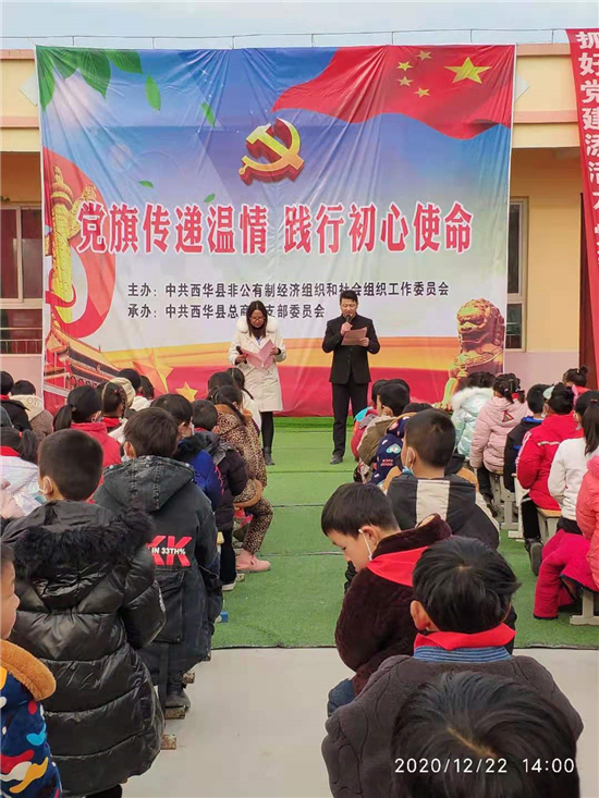 12月22日,西華縣“兩新”組織黨工委聯(lián)合縣總商會(huì)黨支部,在艾崗鄉(xiāng)潘南小學(xué)開(kāi)展“黨旗傳遞溫情、踐行初心使命”愛(ài)心捐助活動(dòng),潘南小學(xué)全體師生及愛(ài)心企業(yè)家共計(jì)200余人參加活動(dòng)。
