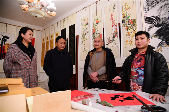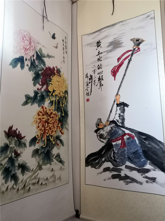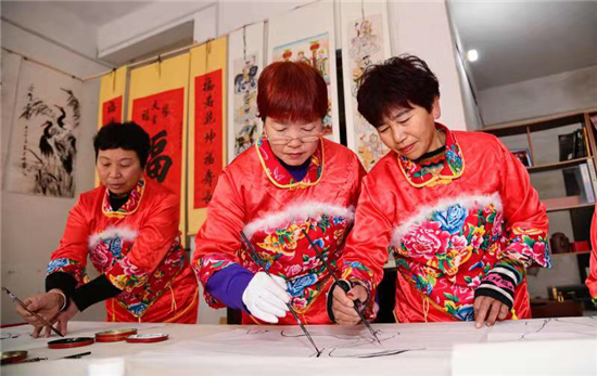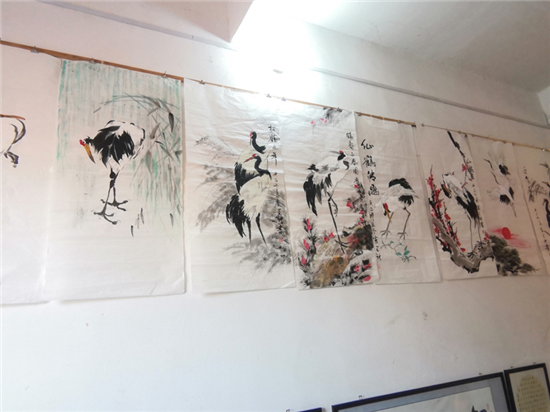 在建豪工作室的斜對(duì)面,是50歲村黨支部書記、村文聯(lián)主席盧全禮的書畫工作室。盧全禮書畫兼擅,還會(huì)武術(shù)、木刻、舞獅子,是附近有名的才子。記者看到,他為太康縣第二屆農(nóng)民豐收節(jié)創(chuàng)作的中國(guó)畫《黃土地的心聲》,以該村嗩吶吹奏藝人幸福而夸張的演出情景,歌頌農(nóng)村脫貧攻堅(jiān)取得的巨大成果,極具鄉(xiāng)土氣息。在他的畫室,滿身文藝范兒的五西村民,正以新時(shí)代松鶴延年吉祥農(nóng)民畫,齊心打造中原畫鶴第一村。經(jīng)過(guò)培訓(xùn)的農(nóng)村大嫂大媽執(zhí)筆齊描畫,一時(shí)鶴鳴九皋,翩翩欲飛。