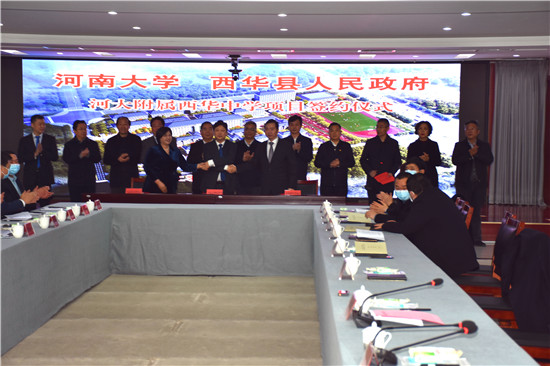 在與會領(lǐng)導(dǎo)的共同見證下,西華縣委副書記、縣長田慶杰與河南大學(xué)黨委常委、副校長許紹康簽訂戰(zhàn)略合作協(xié)議書;西華縣經(jīng)濟(jì)技術(shù)開發(fā)區(qū)管委會主任宋廣良,河南大學(xué)附屬中學(xué)校長蔡建東,河南博遠(yuǎn)教育投資有限公司董事長樊元玲共同簽訂河南大學(xué)附屬西華中學(xué)項(xiàng)目協(xié)議。