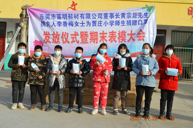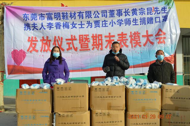 廣東省東莞市富明鞋材有限公司董事長(zhǎng)黃宗昆先生及夫人李香梅女士原籍太康縣馬頭鎮(zhèn)薛廟村,他們得知寒假將至,正值師生、家長(zhǎng)返鄉(xiāng)團(tuán)聚、走親訪(fǎng)友高峰時(shí)節(jié),當(dāng)前疫情防控面臨境外疫情持續(xù)爆發(fā)流行、國(guó)內(nèi)散發(fā)病例頻發(fā)的新情況、新挑戰(zhàn)。為了確保賈莊小學(xué)300多名師生生命安全和身心健康,以及他們近期疫情防控對(duì)口罩的需求,進(jìn)一步增強(qiáng)師生的防控意識(shí),夫妻二人決定為該校捐贈(zèng)3萬(wàn)只一次性醫(yī)用口罩,以實(shí)際行動(dòng)助力該校疫情防控工作。