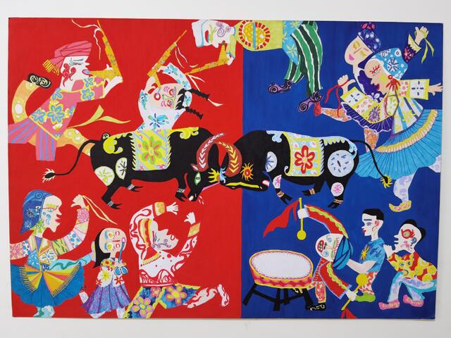 2020年4月,錢玉燕無意中看到“決勝全面小康”第二屆全國農(nóng)民畫展覽征稿啟事,對農(nóng)村生活非常熟悉的她決定一試。她立足于周口平原農(nóng)區(qū)的特色,深深領(lǐng)悟周口幾千年來的農(nóng)耕文化,對參賽作品進(jìn)行了認(rèn)真、系統(tǒng)地構(gòu)思,最終決定以歡慶豐收的斗牛活動為題材,把農(nóng)耕文化的深遠(yuǎn)、厚重與豐富的藝術(shù)表現(xiàn)手法相融合。她采用普通的繪畫卡紙,運用多種繪畫顏料,充分借鑒漢畫藝術(shù),吸收中原地區(qū)的剪紙文化、西方藝術(shù)大師畢加索立體畫派的藝術(shù)風(fēng)格和古埃及畫的靈感,以艷麗的紅、藍(lán)為主背景,采取夸張的表現(xiàn)手法,把斗牛的場景表現(xiàn)得淋漓盡致。作品創(chuàng)作發(fā)揮了豐富的想象力,人物動物造型借鑒中國民間藝術(shù)剪紙的方式表現(xiàn),以大膽、夸張、強烈的色彩搭配,把無限深廣的空間“壓扁”到一個平面上。