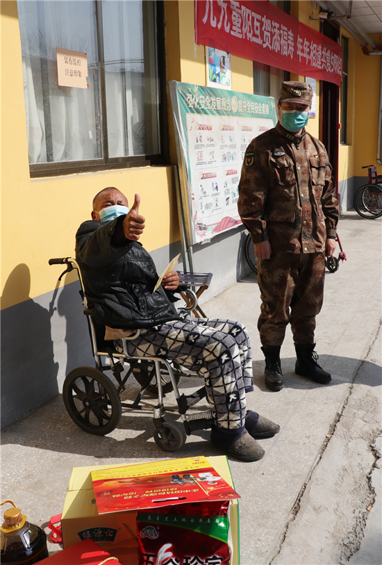 新橋鎮(zhèn)新兵楊凱入伍前和癱瘓的父親相依為命,市人武部領(lǐng)導(dǎo)協(xié)調(diào)地方政府,把其父親送到了新橋鎮(zhèn)敬老院公費(fèi)養(yǎng)老,解除他的后顧之憂。春節(jié)到了,人武部領(lǐng)導(dǎo)還牽掛著這個(gè)特困家庭,矯百成帶隊(duì)來(lái)到新橋鎮(zhèn)敬老院。此時(shí)正值中午,楊凱的父親正坐在屋外的輪椅上曬太陽(yáng),見(jiàn)到矯部長(zhǎng)的突然到來(lái),激動(dòng)的眼含熱淚,他緊緊握住矯百成的手久久不愿松開(kāi)。矯百成噓寒問(wèn)暖,給他送上1000元慰問(wèn)金和生活必需品,楊凱的父親用他那不太清晰的語(yǔ)言表達(dá)對(duì)部長(zhǎng)的真誠(chéng)感謝。在敬老院院長(zhǎng)的帶領(lǐng)下,矯百成又來(lái)到老人的住室察看起居情況,詢問(wèn)他平時(shí)生活狀況,當(dāng)?shù)弥先松畹暮苁娣r(shí),矯百成滿意的笑了。