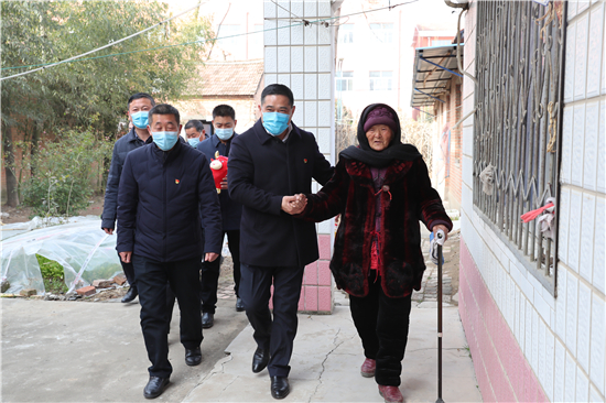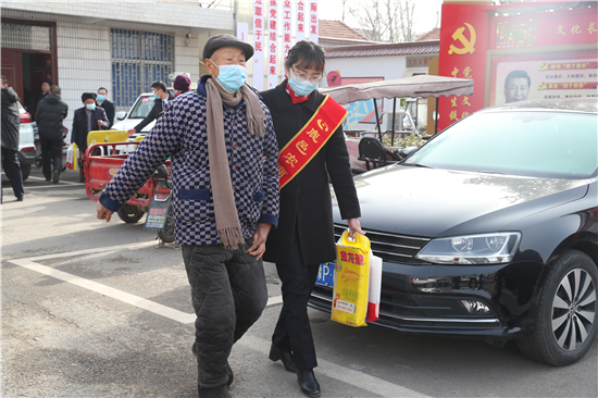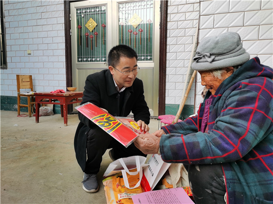 在鄭家集鄉(xiāng)韓樓村,縣農(nóng)商銀行鄭家集支行行長武繼龍帶領(lǐng)員工來到92歲韓老漢的家中,看到韓老漢由于身體原因只能靠拐棍佝僂著背站著,武繼龍緊忙彎腰俯下身說:“大爺,快過年了,我們來看看您,提前給您拜個早年!”“真的是太感謝恁了,這么冷的天,還讓你們來送到家里面。”韓老漢激動地說。