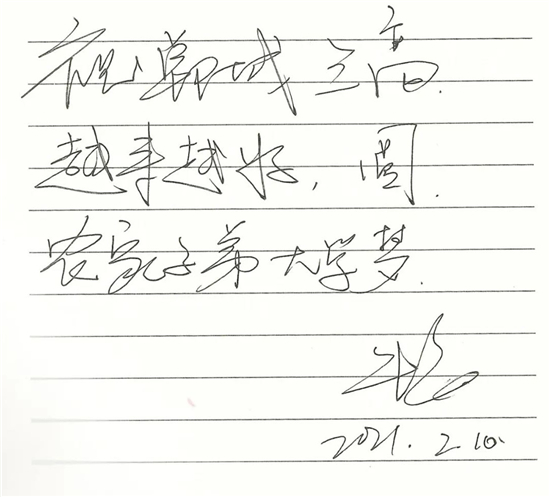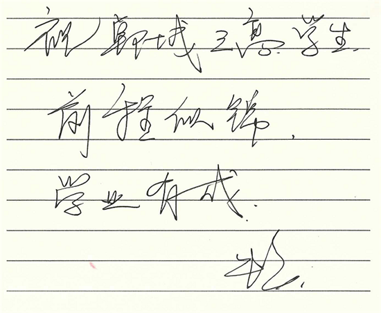 朱婷雖然很少回家,但是一直關(guān)注老家鄲城的發(fā)展變化,特別關(guān)注鄲城的教育發(fā)展,當(dāng)她得知鄲城三高率先提煉出“孝、勤、韌、忠、濟(jì)”為核心的朱婷精神,并把這種精神作為鄲城三高學(xué)子的精神引領(lǐng)時(shí)非常感動(dòng),為鄲城三高始終堅(jiān)持立德樹人的教育理念而高興,為鄲城三高學(xué)子的拼搏進(jìn)取精神而欣慰,為鄲城三高辦學(xué)成果而點(diǎn)贊,并欣然寫下:“ 祝鄲城三高越來(lái)越好,圓農(nóng)家子弟大學(xué)夢(mèng);祝鄲城三高學(xué)生前程似錦,學(xué)業(yè)有成?!?/p>