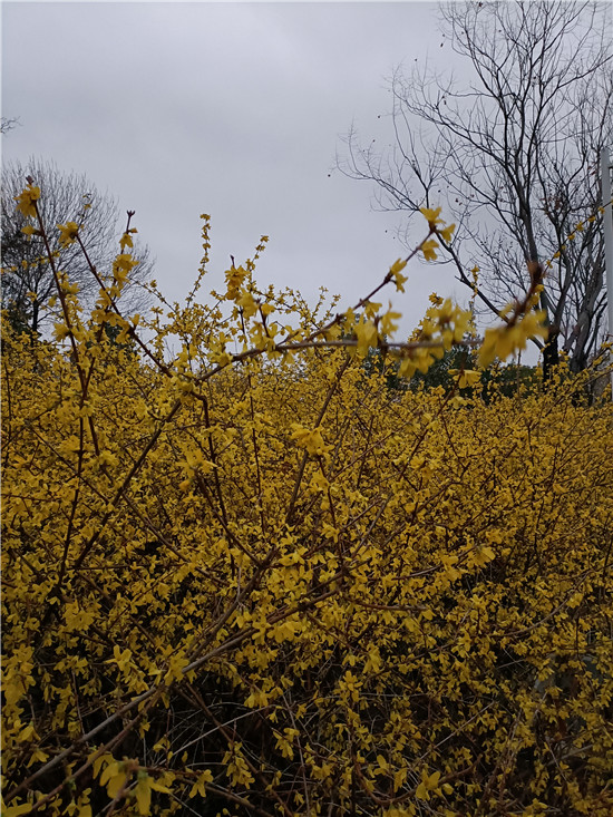 黃色的迎春花似云霞滿天,白色的玉蘭花婀娜多姿,紅色玉蘭含苞待放,即將飄零的臘梅老也留戀枝頭,舍不得離去,鮮艷的百花醉得垂柳在水面上扭起纖細(xì)的枝條。